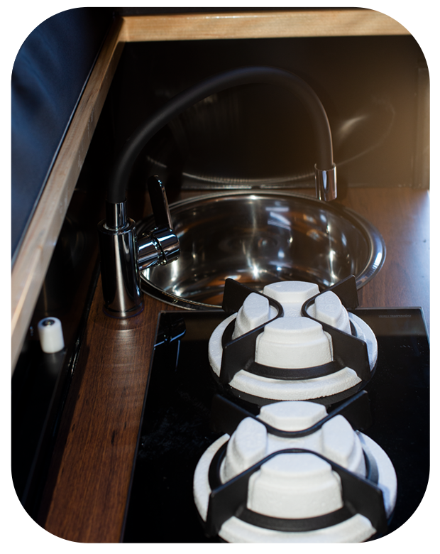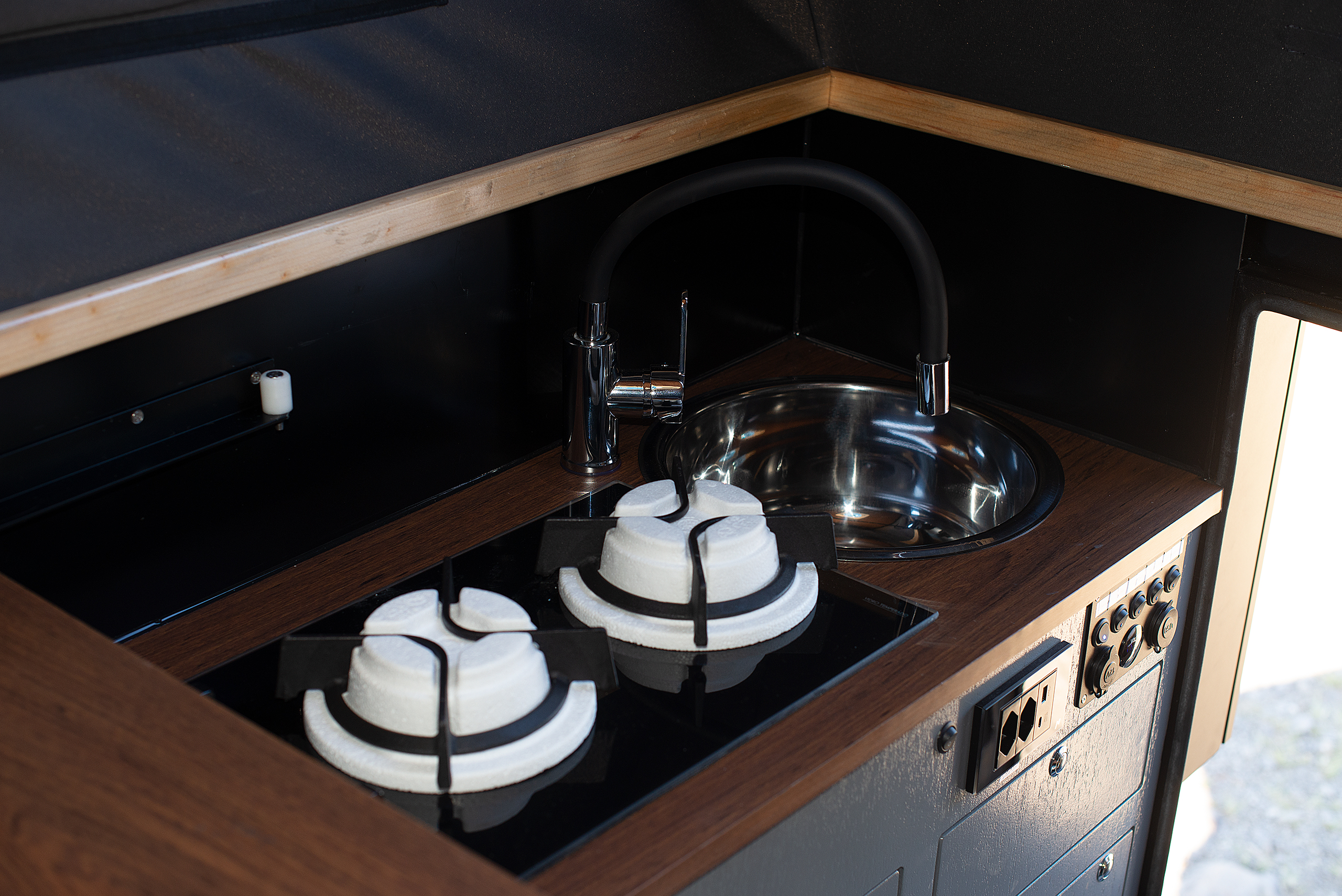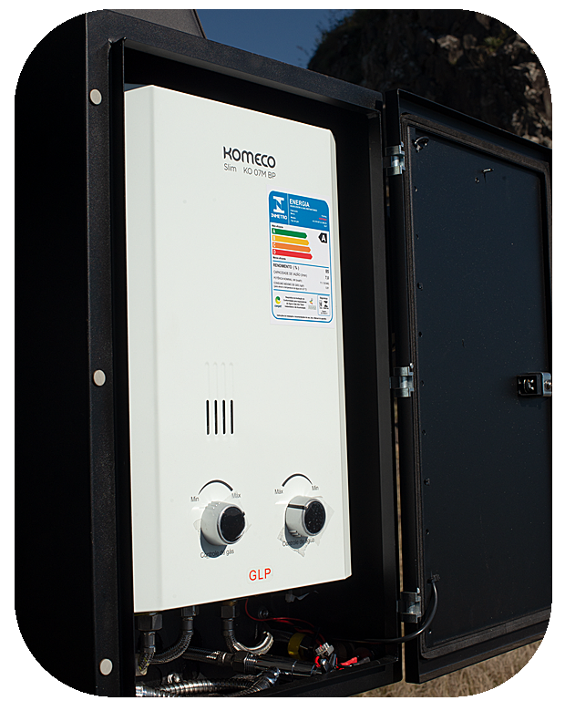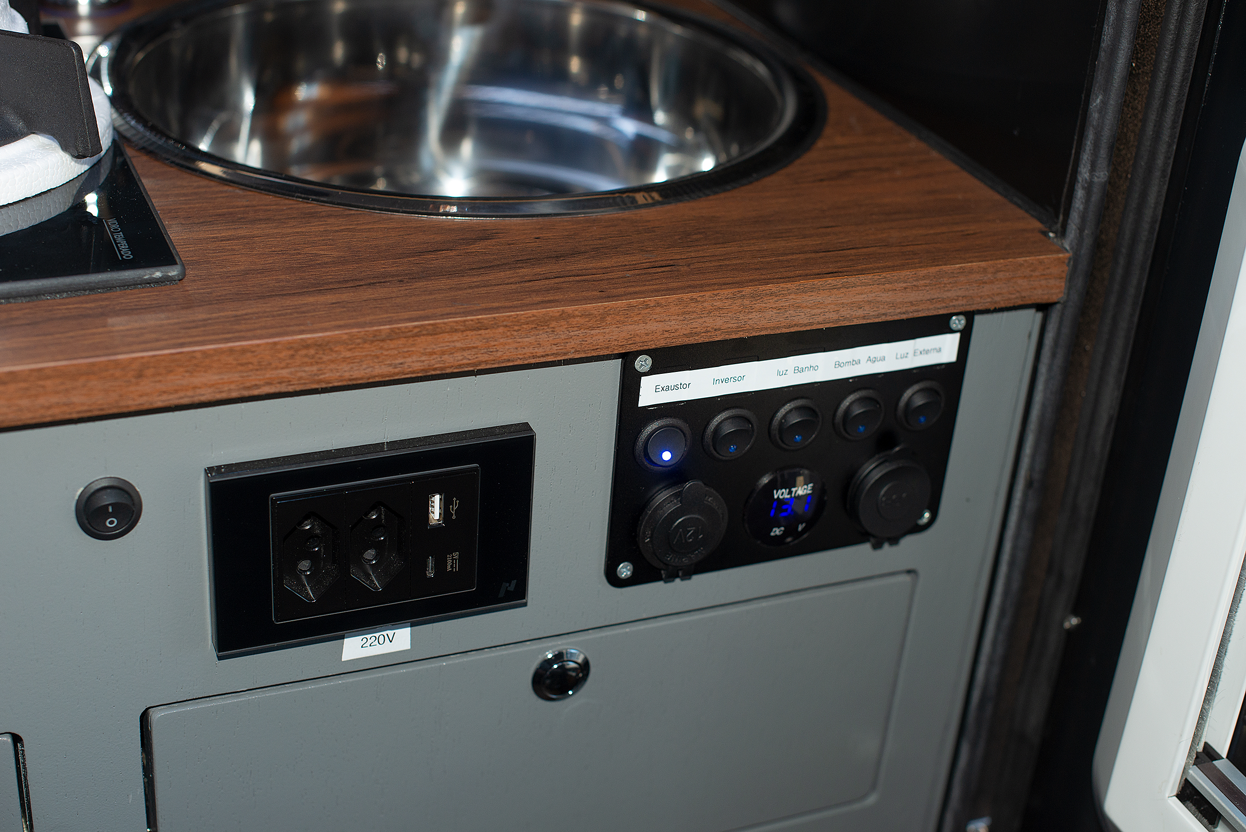 com fogão a gás interno 1 boca e externo 2 bocas, pia com água quente/fria e geladeira 35 litros.
