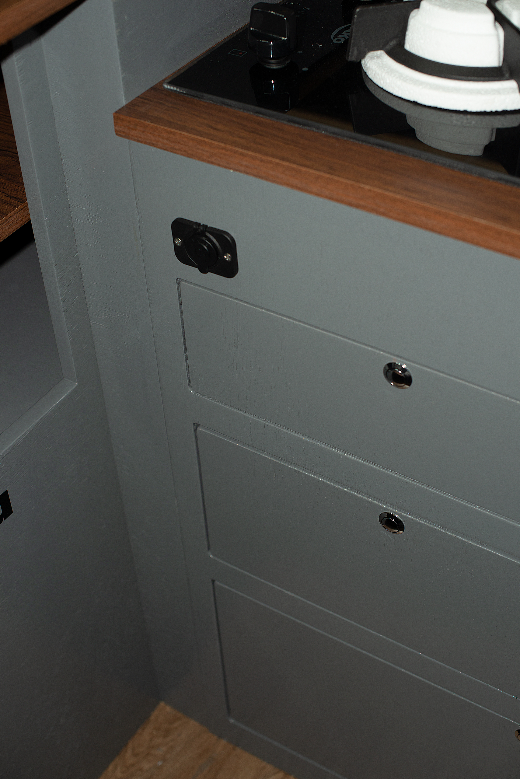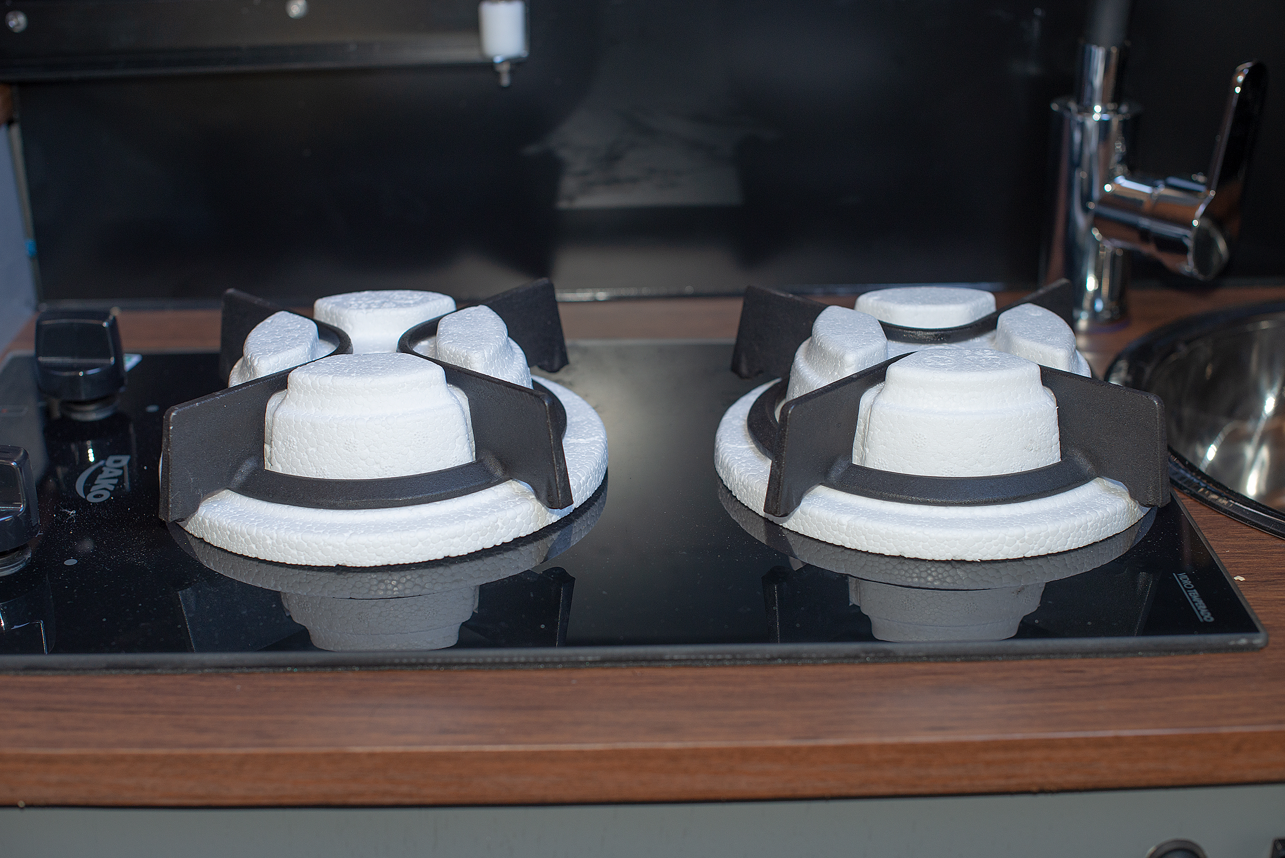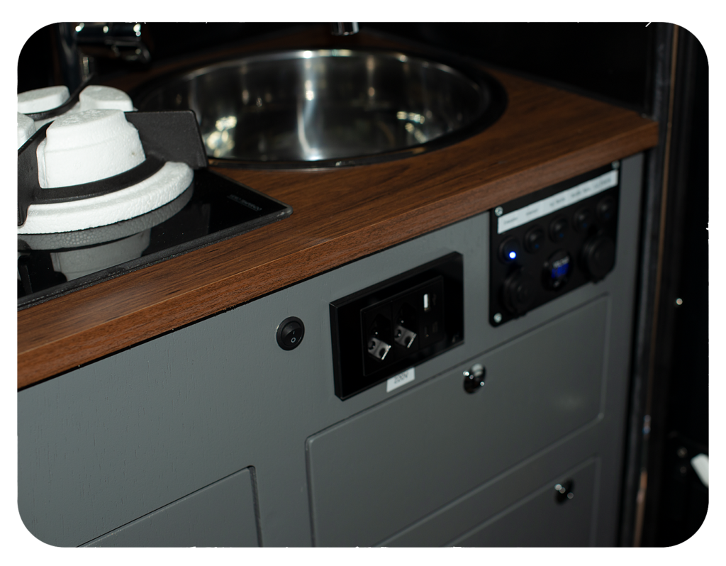 com fogão a gás interno 1 boca e externo 2 bocas, pia com água quente/fria e geladeira 35 litros.